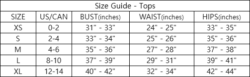 ? Bust: XS 28" , Small 30" , Med 32" , Large 34"